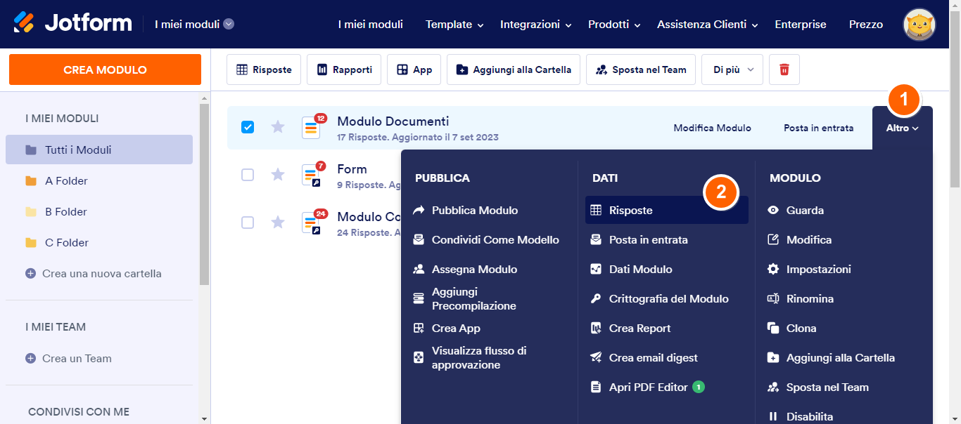 Puoi anche gestire le risposte scorrendo con il mouse sopra al modulo desiderato, cliccando su Altro e scegliendo Risposte dal menù.