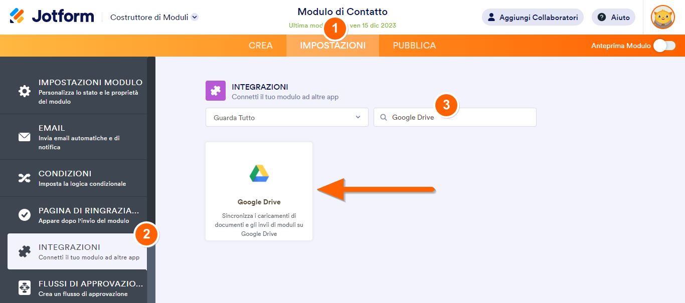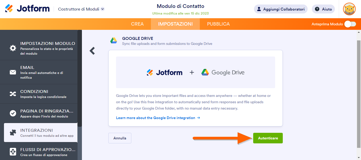 Per integrare il tuo modulo con Google Drive procedi in questo modo: