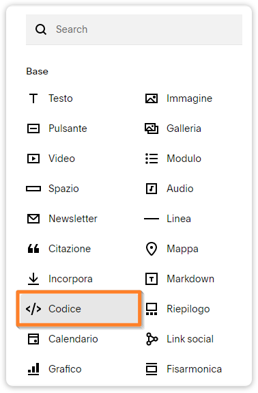 4. Il codice appena copiato va inserito su un blocco di codice nella tua pagina Squarespace. Per sapre come aggiungere un blocco alla tua pagina, apri questa guida. Scegli “Codice” come mostrato di seguito: