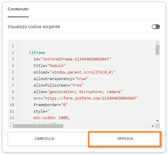 5. Incolla il codice nell’apposita casella. Quindi clicca su “Applica“. Apparirà un’anteprima del tuo modulo: