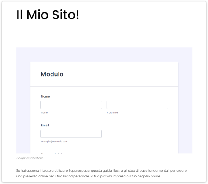 Nota: Se il tuo modulo non funziona correttamente una volta incorporato sul tuo sito Squarespace, potresti aver bisogno di disabilitare il caricamento di componenti Ajax sul tuo sito. Segui questo link per maggiori informazioni.