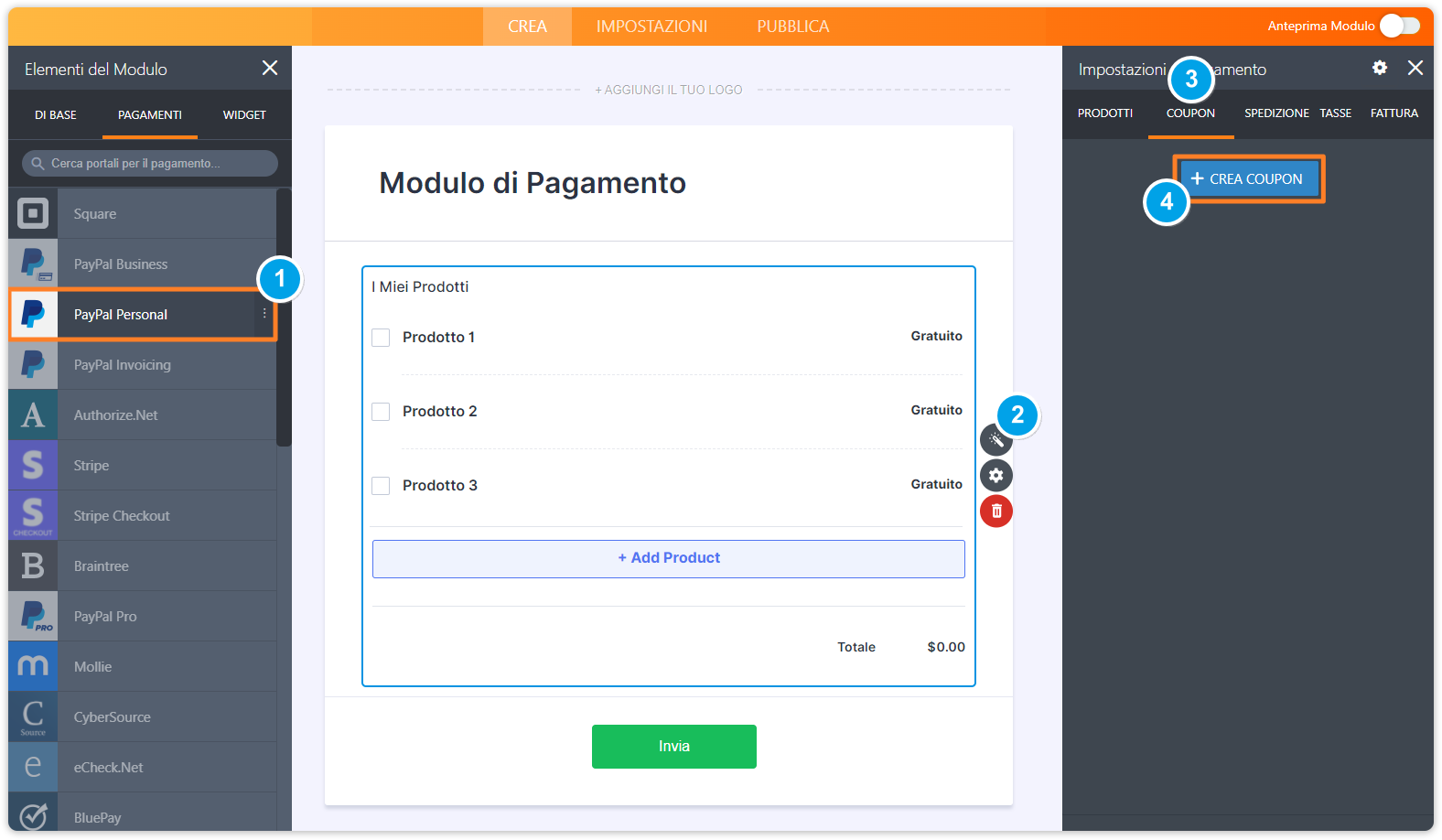 Puoi ora aggiungere i codici sconto coupon ai tuoi moduli di pagamento Jotform. In questa guida vedrai come aggiungere un Codice Coupon, in aggiunta alle opzioni standard dei moduli di pagamento descritte nella guida Come Aggiungere Opzioni ai Moduli di Pagamento.
