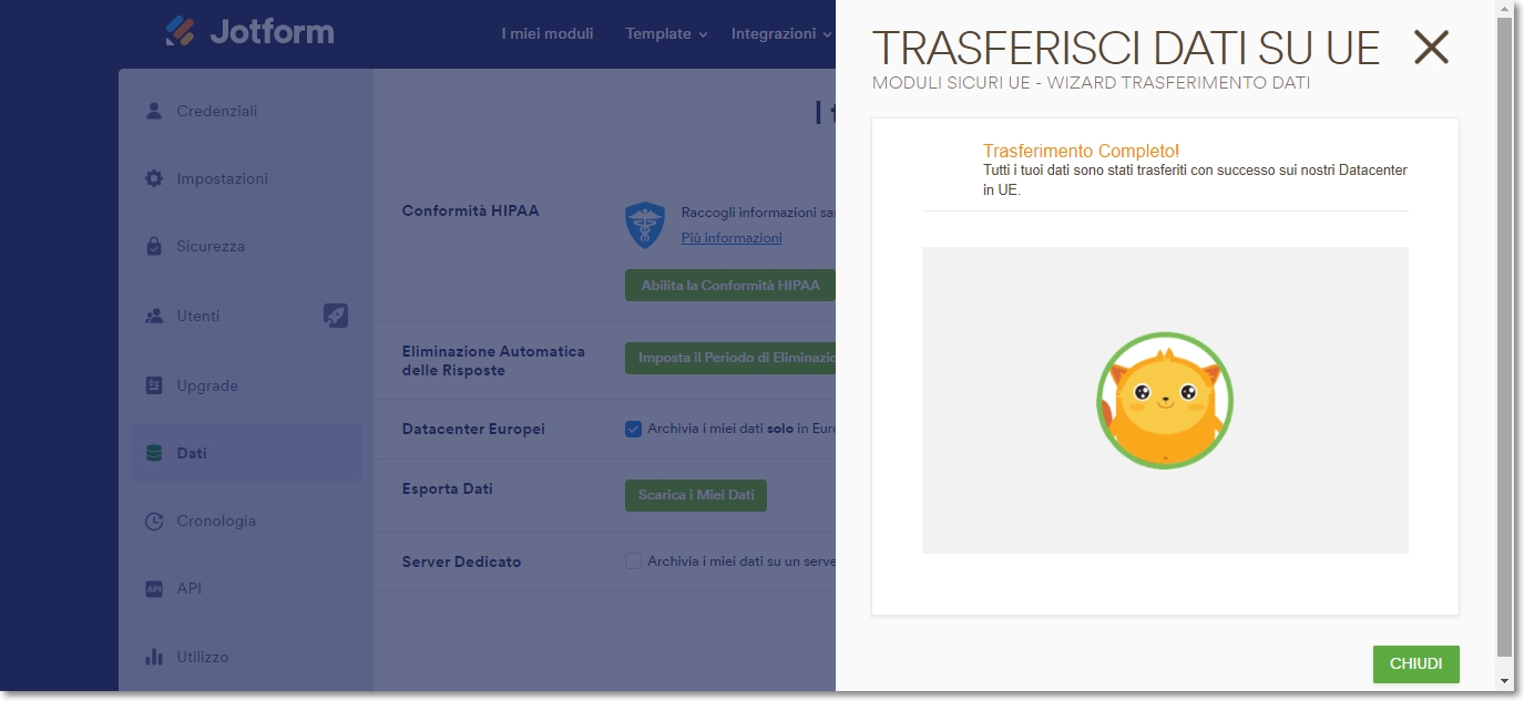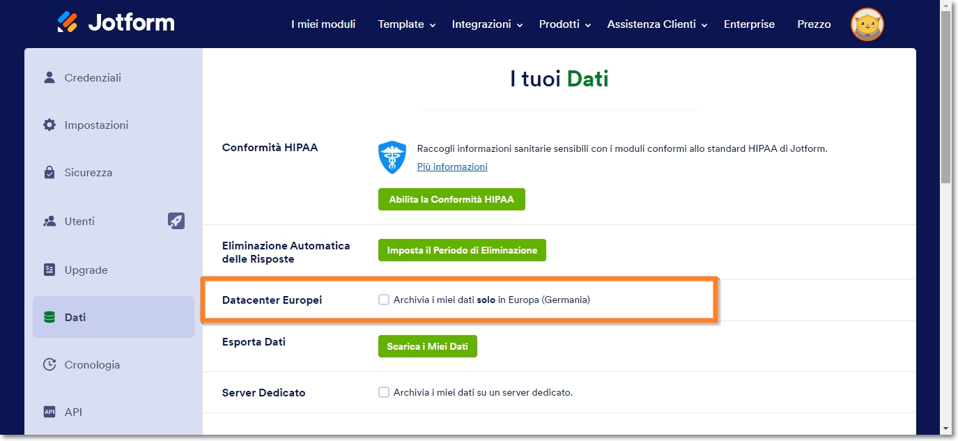 La conformità al GDPR è una prerogativa molto importante per Jotform. Se risiedi in un paese appartenente allo Spazio Economico Europeo (UE), o fai affari nell’Unione Europea, hai l’obbligo di archiviare i tuoi moduli e dati nei Datacenter Europei. Quando un account viene creato da un paese membro dell’Unione Europea, Jotform attiva automaticamente i Datacenter Europei. Se pensi di non essere ancora in regola con la normativa GDPR, in questa guida troverai tutti i passi da seguire per essere conforme al GDPR.