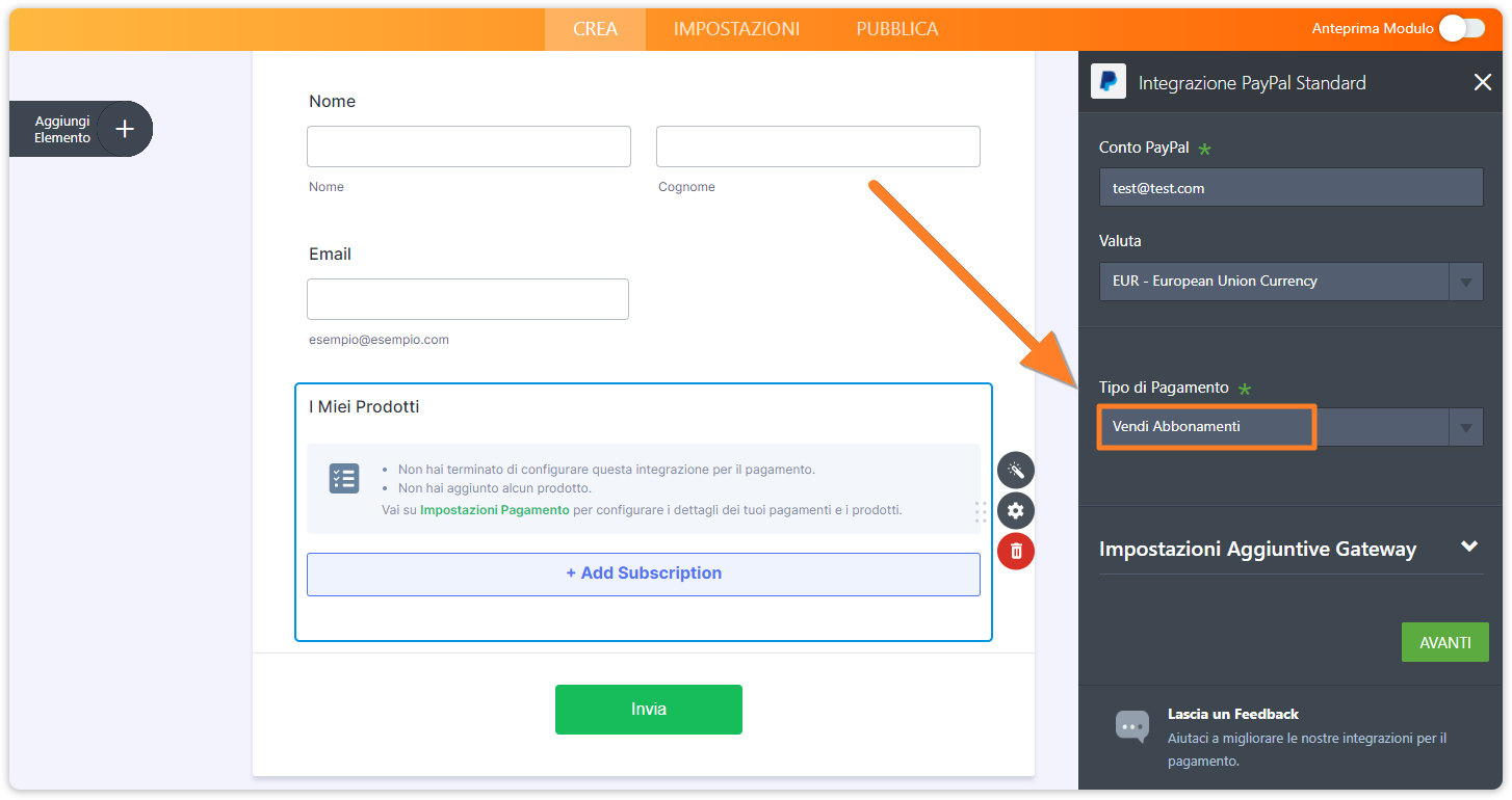 Sarà possibile quindi configurare i dettagli dell’abbonamento, come prezzo, durata dell’abbonamento, numero di pagamenti, ecc.