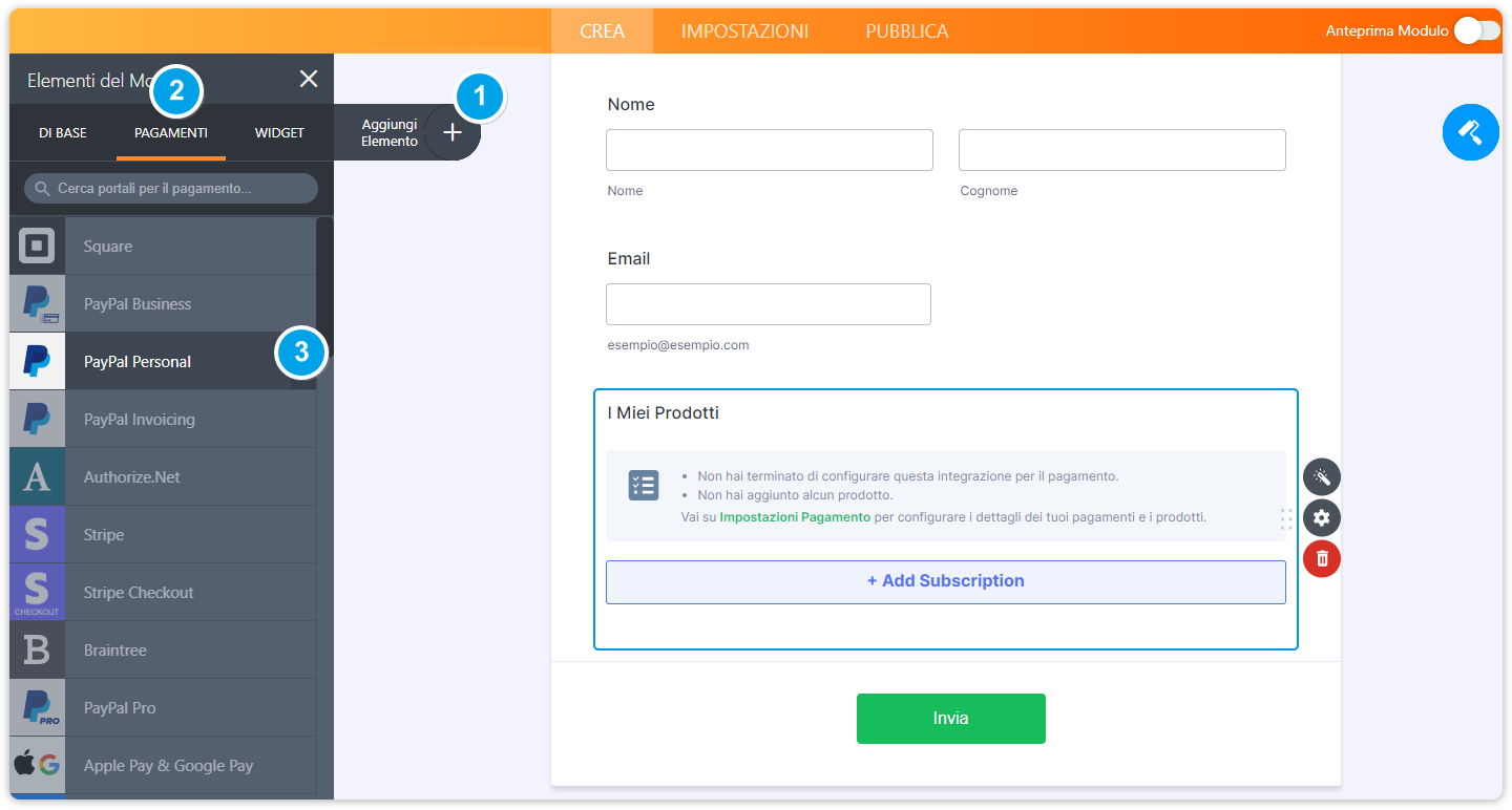 3. Scegliere il metodo di pagamento desiderato (es. PayPal Personale).