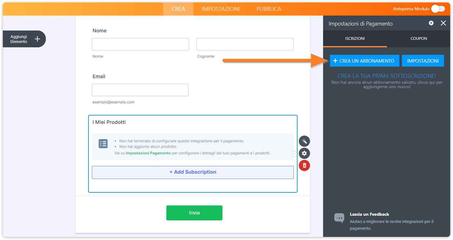 7. Successivamente cliccare sul pulsante Crea Un Abbonamento.