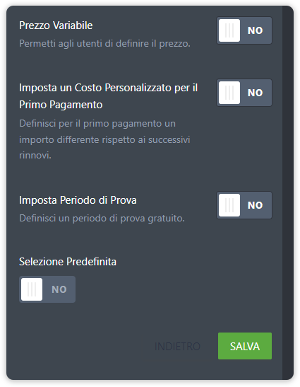 - Imposta Periodo di Prova – per concedere ai tuoi clienti un periodo di prova. È possibile impostare il periodo di prova fino ad un anno.