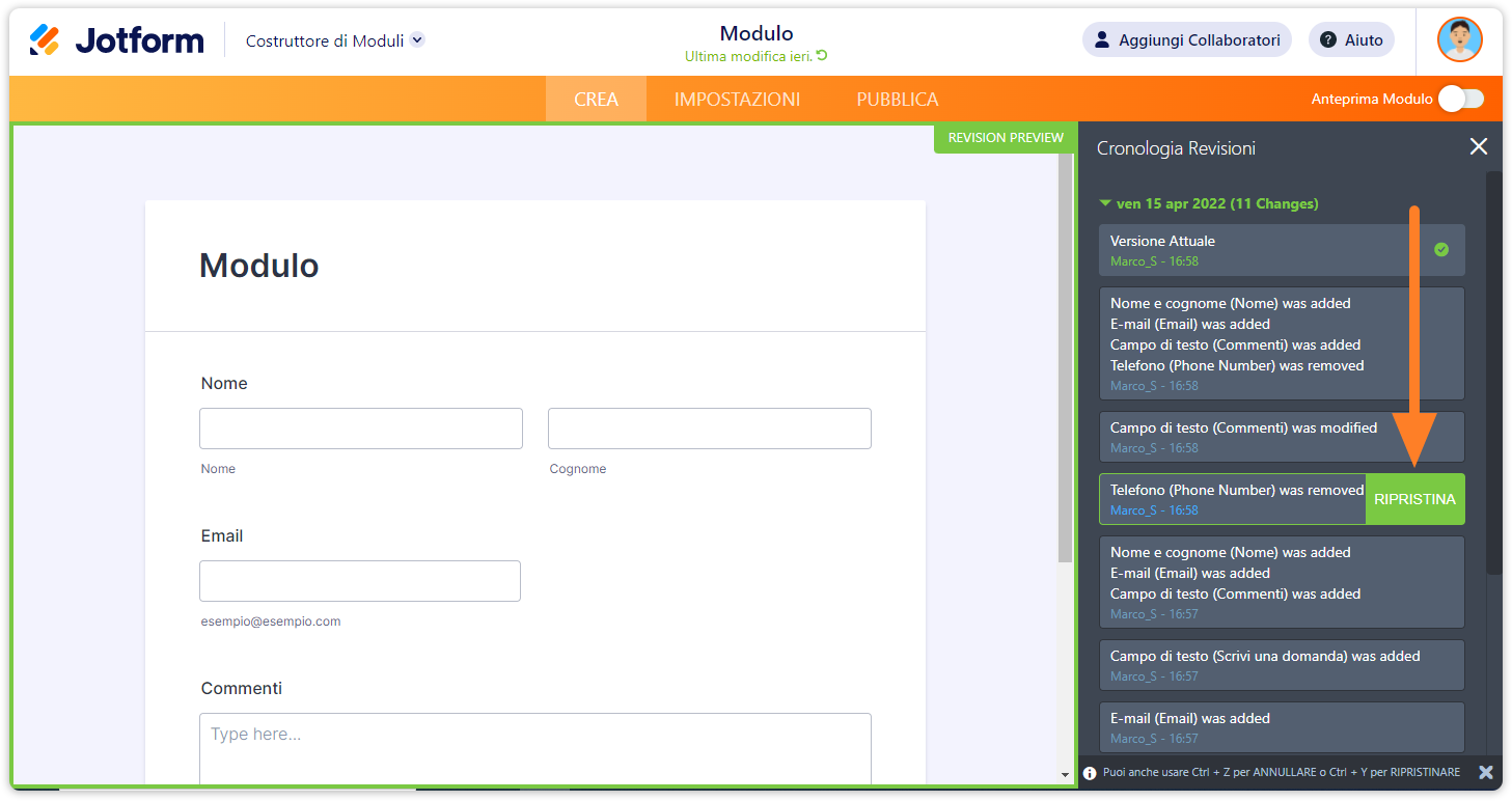 Si aprirà il pannello Cronologia Revisioni, con la lista delle modifiche effettuate al tuo modulo.