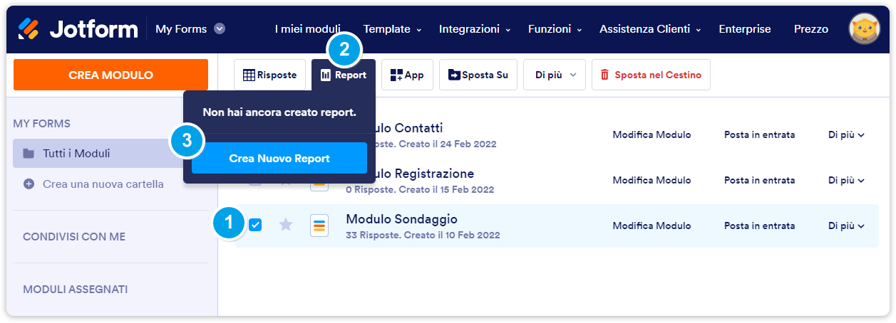 Puoi anche accedere ad un report relativo ad uno specifico modulo, dalla pagina I Miei Moduli.