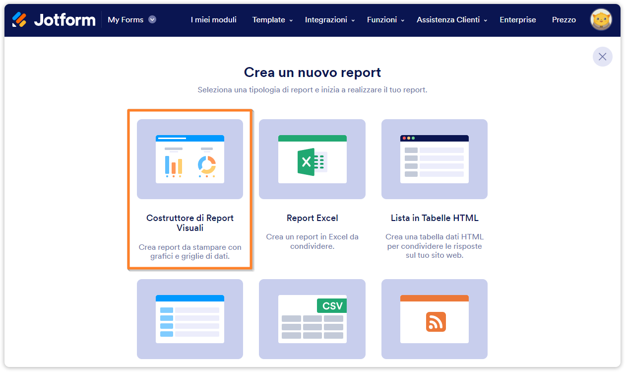 - Clicca sul pulsante Crea Report e seleziona Costruttore di Report Visuali nella finestra Crea un nuovo report.