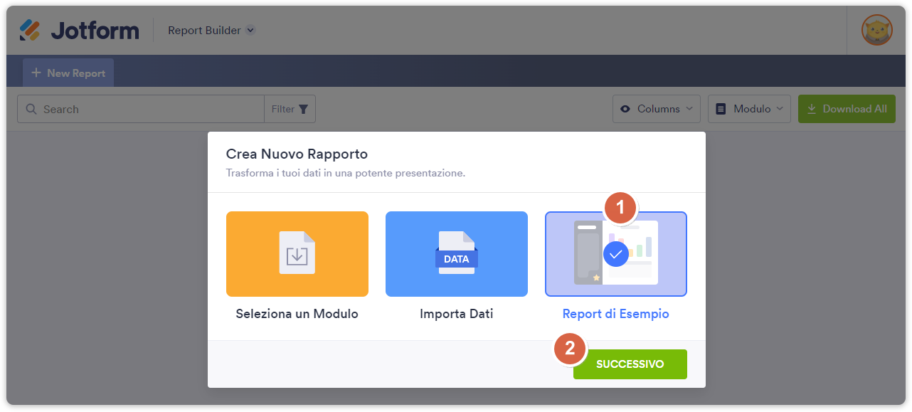 - Clicca il pulsante Crea Nuovo Report