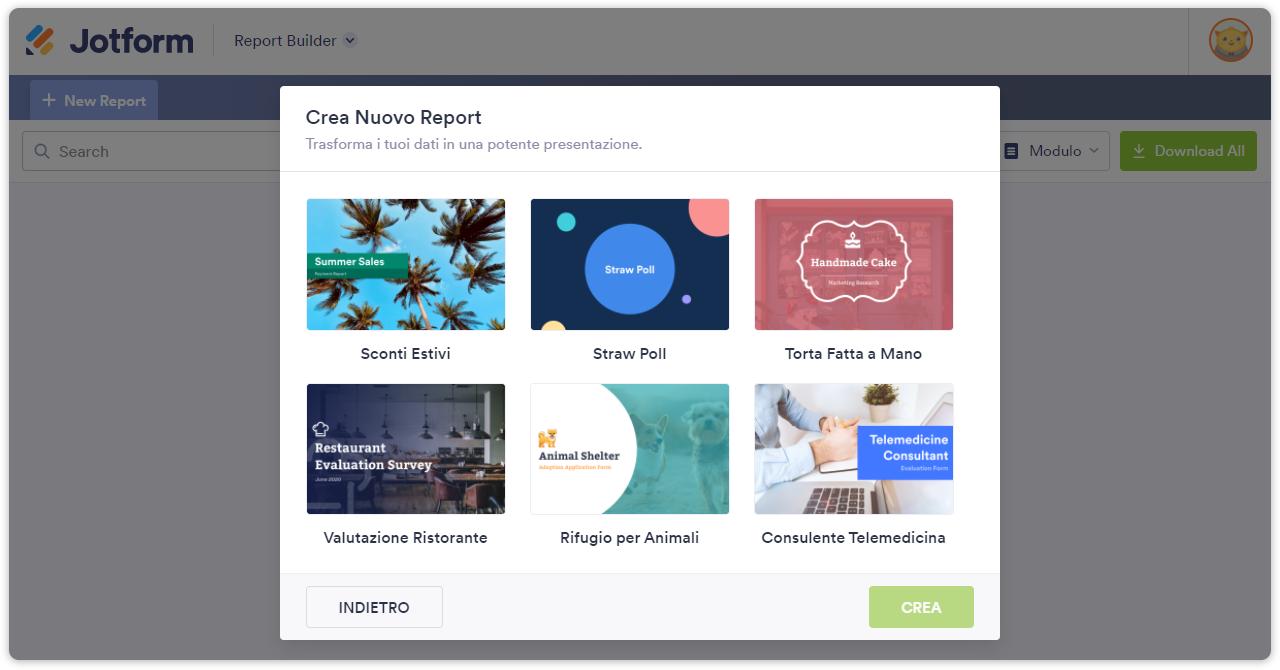 - Scegli un nome e la tipologia di report e premi il pulsante Crea.