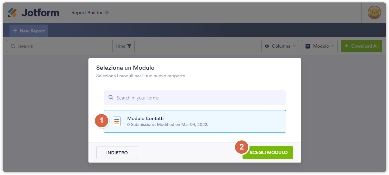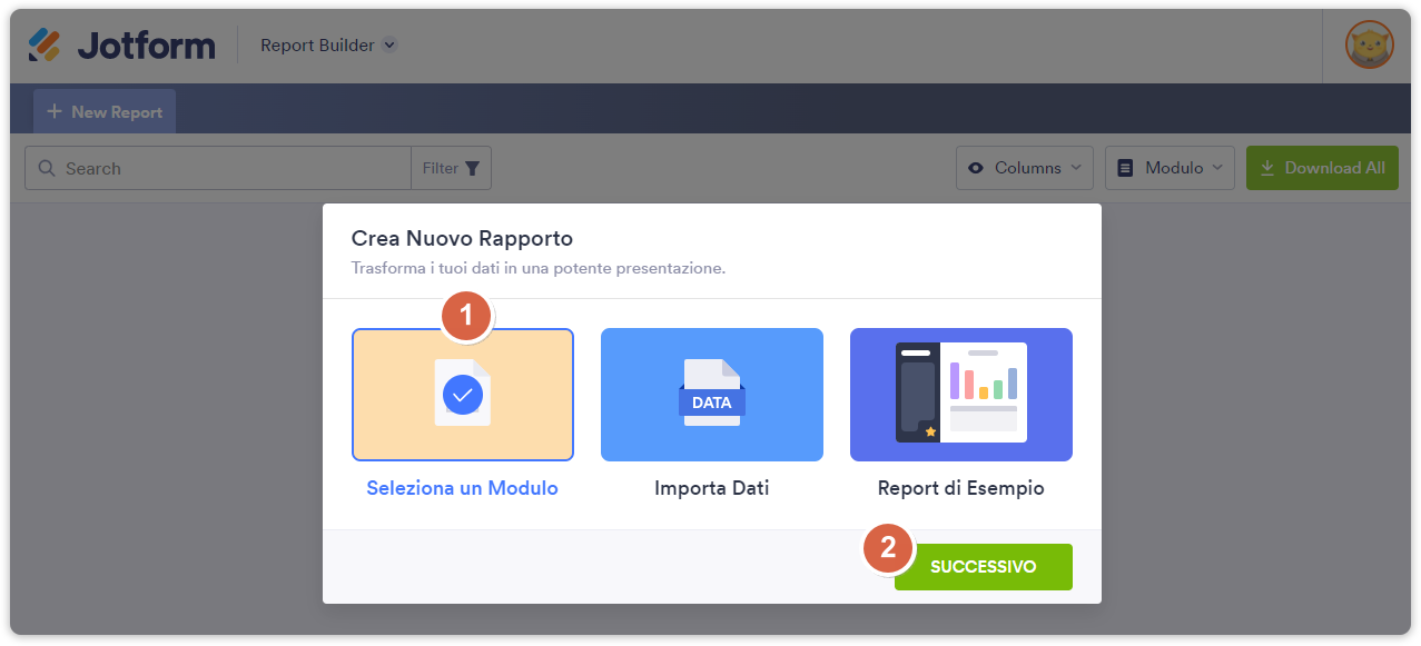 - Scegli l’opzione Seleziona un Modulo e clicca sul pulsante Successivo.