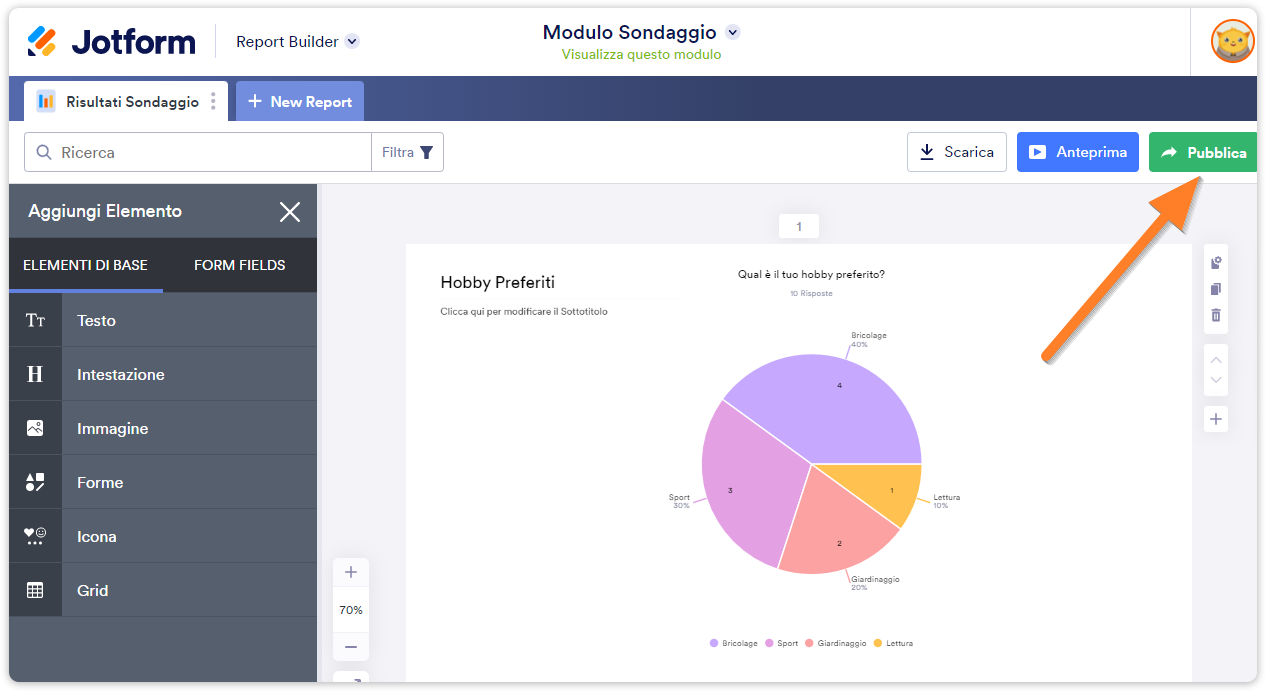 Una volta creato il report con i dati del tuo modulo, potrai condividerlo con i tuoi collaboratori o incorporarlo sul tuo sito web. Queste funzionalità sono disponibili cliccando sul pulsante Pubblica Report.