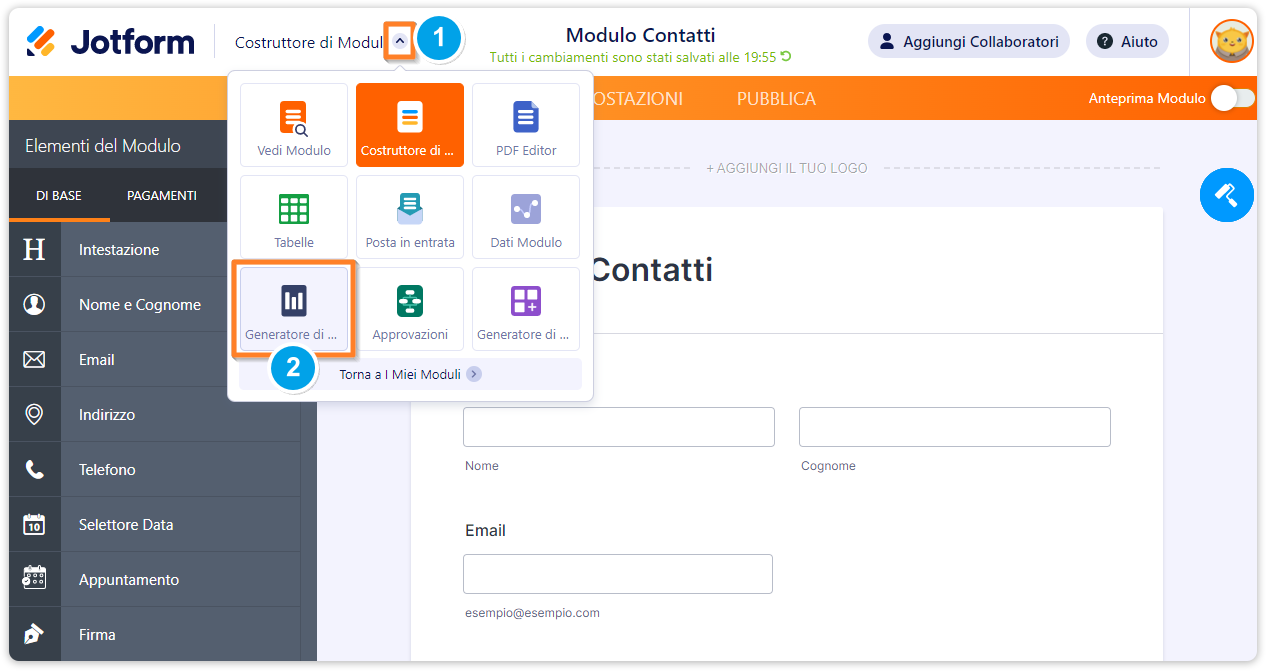 Puoi accedere velocemente al costruttore di report da qualsiasi pagina Jotform (Costruttore di Moduli, PDF Editor, Tabelle, Inbox, etc). Scegliendo l’opzione Report Builder dal menù, si aprirà la pagina del Costruttore di Report.