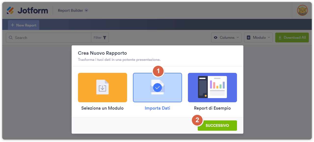 Dalla pagina I Miei Report, cliccando il pulsante Crea Report e selezionando il Costruttore di Report Visuali, hai la possibilità di creare un report utilizzando dati importati.