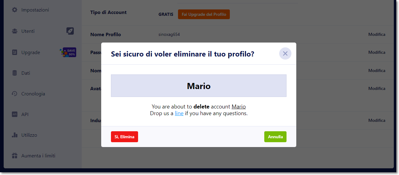 3. Dalla finestra popup, confermare l’eliminazione dell’account cliccando sul pulsante Sì, Elimina.