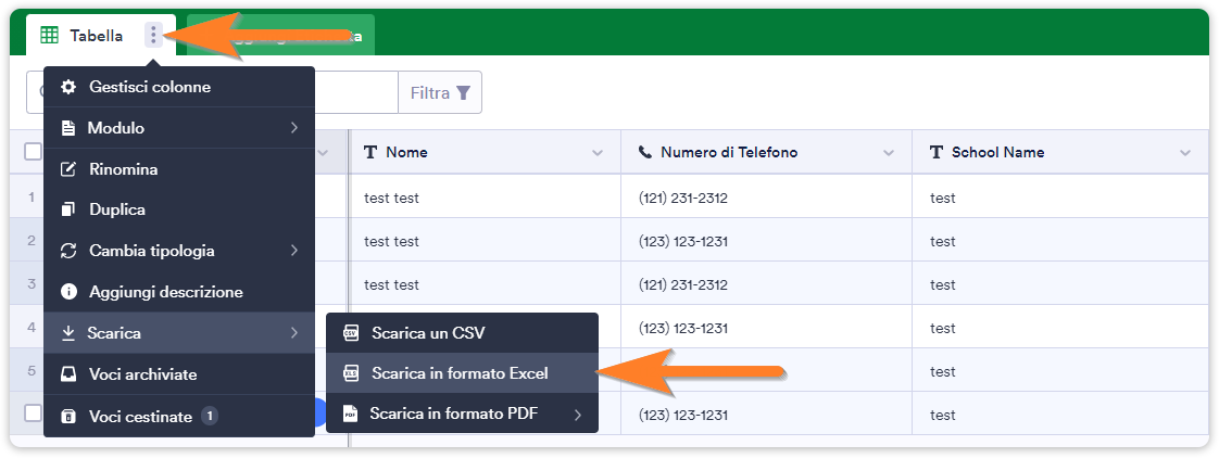 In alternativa, puoi anche cliccare i tre puntini verticali sul tab della tabella delle risposte, spostando il mouse sull’opzione Scarica e cliccando sull’opzione Scarica in formato Excel.