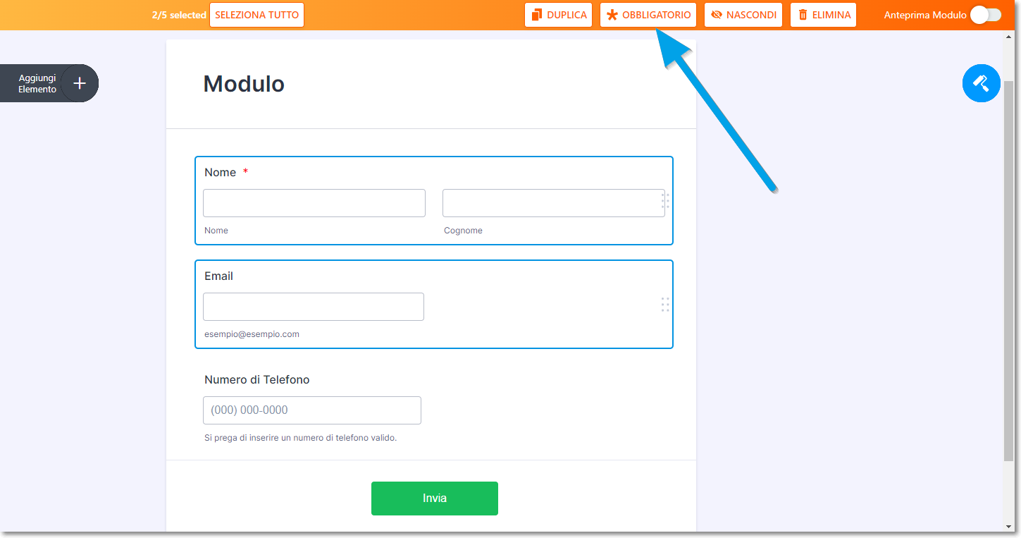 2. Dalla barra in alto del Form Builder, cliccare sul pulsante Obbligatorio oppure su Non Obbligatorio.