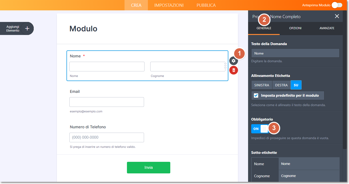 Se sul tuo modulo hai campi obbligatori che desideri rendere invece facoltativi, basterà ripetere i passi visti sopra, ma impostare il selettore Obbligatorio su “Off”.