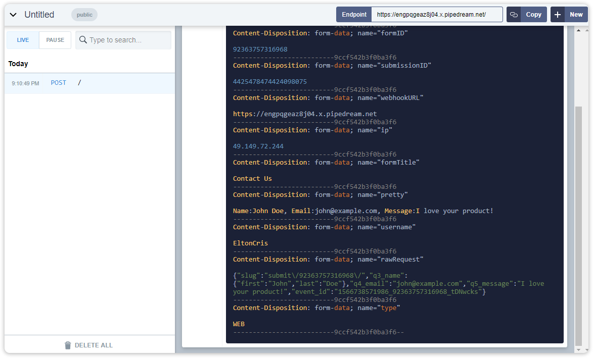 Per ispezionare o eseguire il debug di una richiesta webhook, puoi utilizzare RequestBin. Ti basterà creare un Request Bin e impostare l’URL di endpoint nel webhook del tuo modulo (come mostrato nella schermata al punto 2). Effettua un invio reale del tuo modulo, quindi controlla i dati raccolti nel Request Bin.
