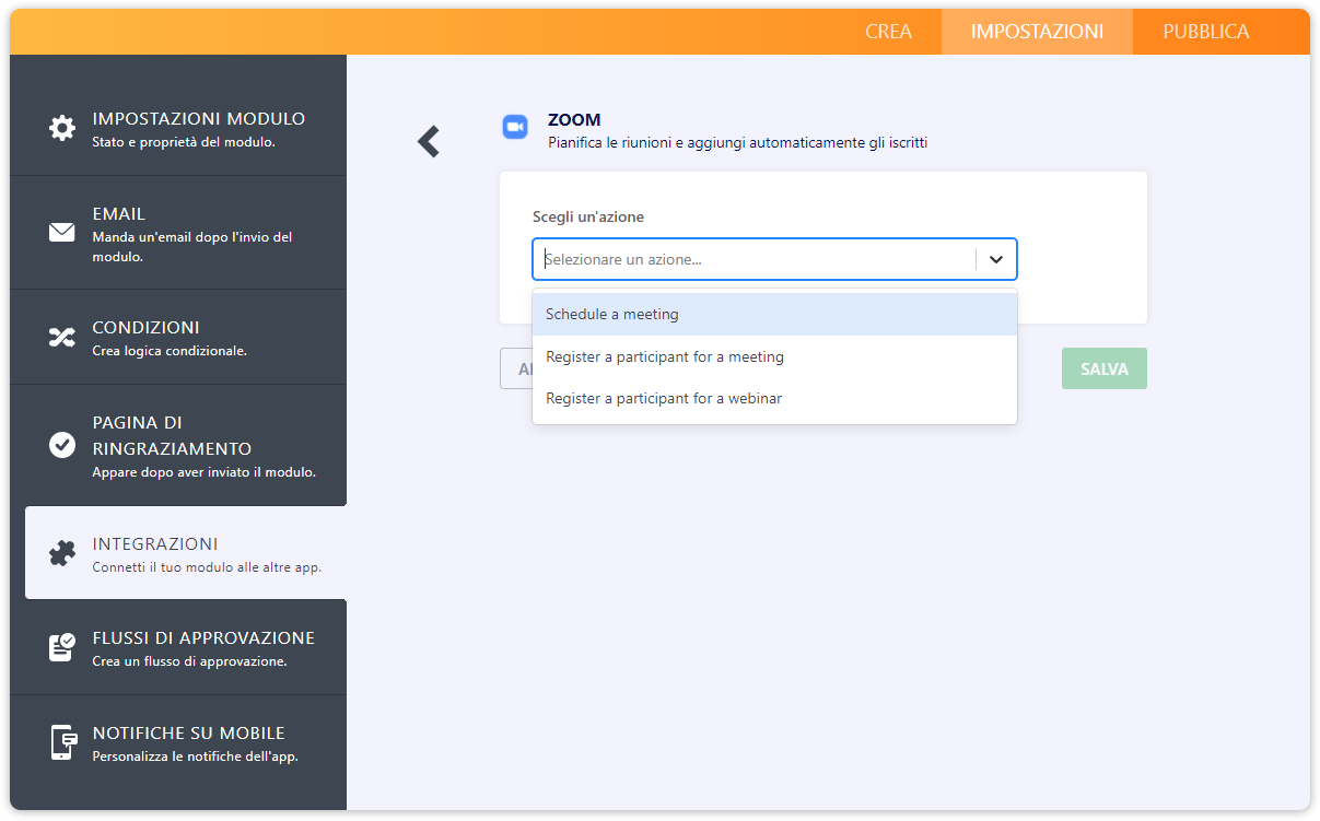 4. Una volta effettuata l’autenticazione al tuo account Zoom, selezionare un’azione dal menù a tendina.