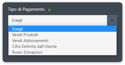 4. Selezionare se si desidera vendere prodotti, abbonamenti (con pagamenti ricorrenti), ricevere importi definiti dall’utente, o donazioni.