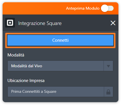 3. Connettere il modulo all’account Square, cliccando sul pulsante Connetti, quindi effettuare il login dalla finestra di popup.