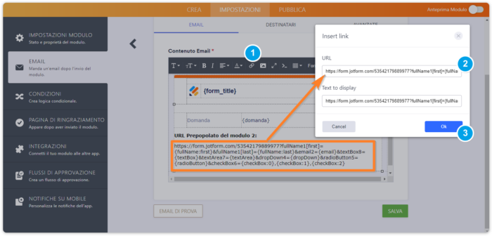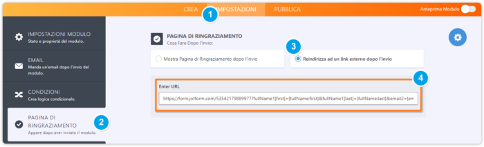 Passo 2 – Ora andremo ad aggiungere il nostro URL precompilato per il modulo 2, sul template dell’email di notifica o di risposta automatica per avere una copia sull’email, e sulla pagina di ringraziamento in modo da reindirizzare l’utente.