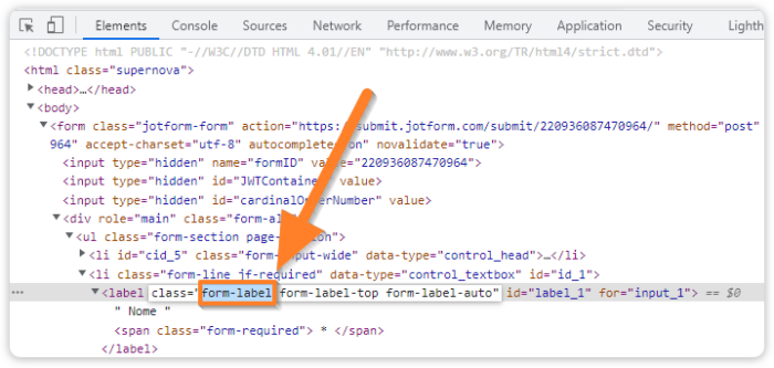 Se desideri nascondere tutte le etichette del tuo modulo in un colpo solo, puoi utilizzare il selettore della classe. Ad esempio: .form-label. Il codice finale da utilizzare sarà: .form-label{display:none !important;}