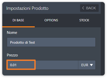 1. Per prima cosa, crea un prodotto di test nel tuo modulo, e imposta il prezzo ad un centesimo di euro 0,01€.