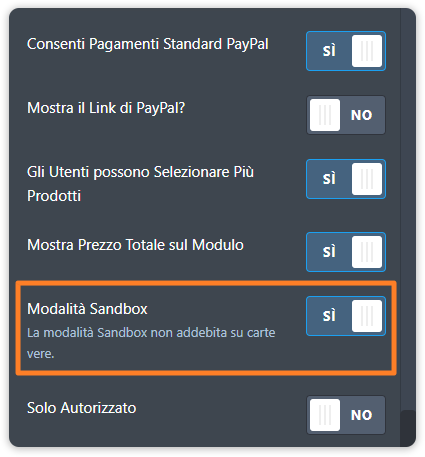 IMPORTANTE: Dopo aver inserito le credenziali PayPal, devi abilitare la modalità SANDBOX prima di procedere con il test.