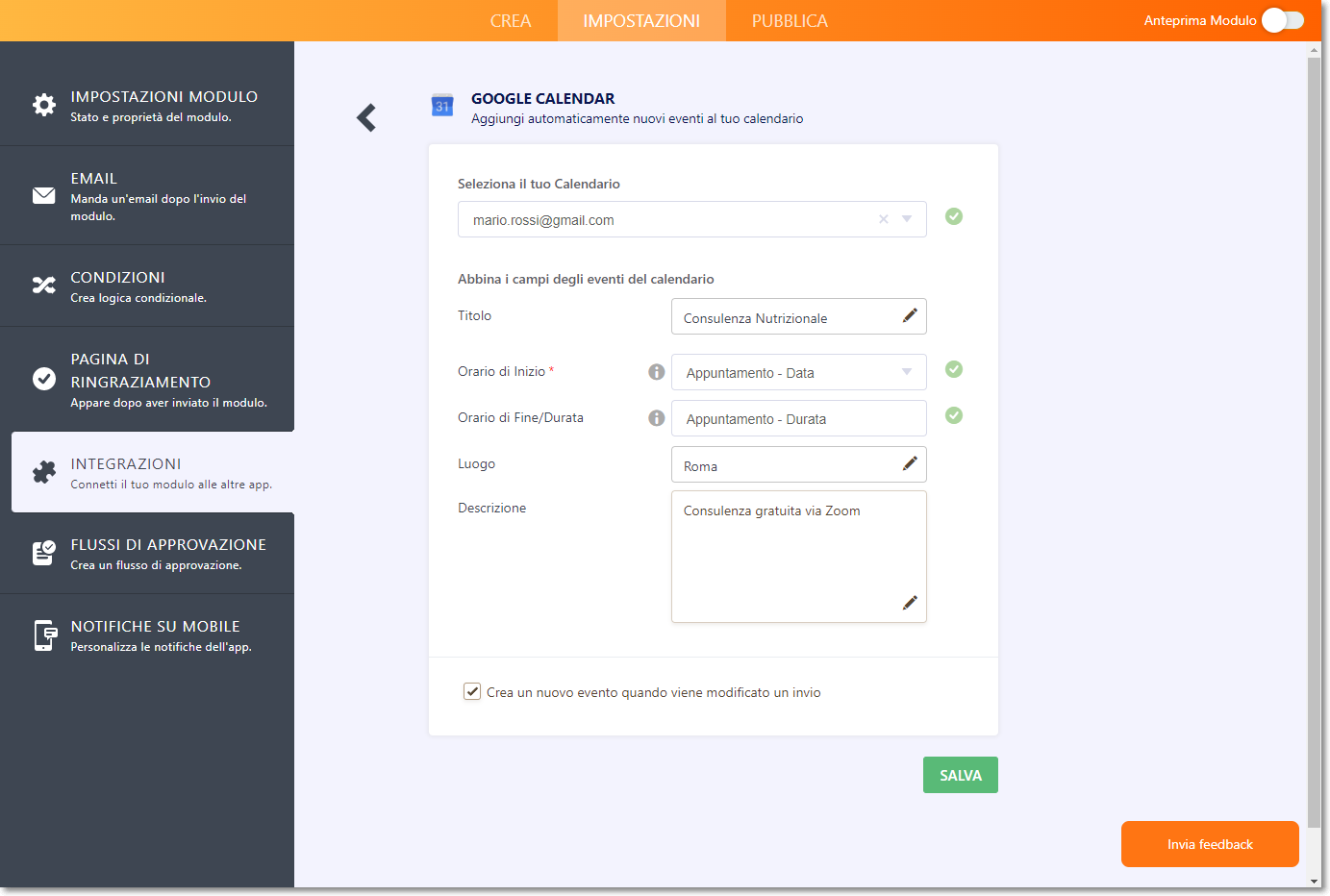Ed è tutto! La tua integrazione è pronta, e ogni volta che riceverai una nuova risposta sul tuo modulo, verrà creato un nuovo evento sul tuo Calendario Google.