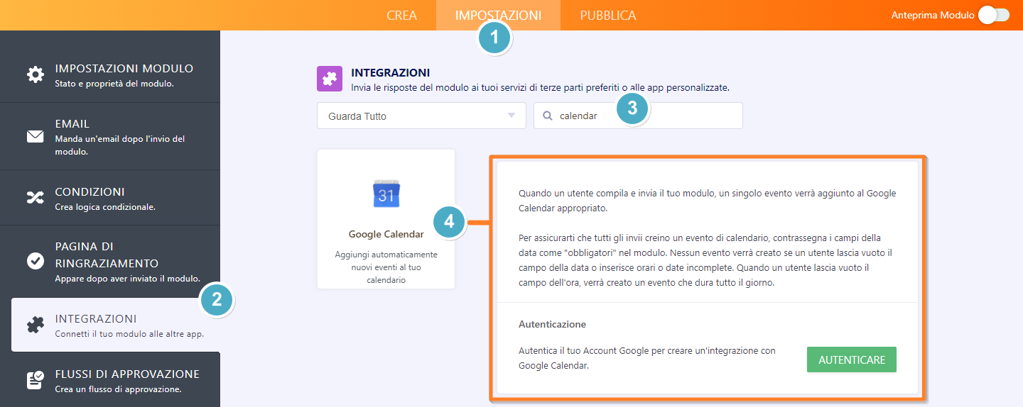 1. Dal Form Builder aprire andare al tab Impostazioni.