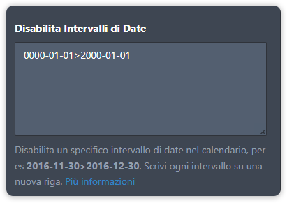 • Disabilita Date Personalizzate – disabilita soltanto specifiche date. Il formato da utilizzare in questo caso per specificare quali date vuoi disabilitare, è AAAA-MM-GG ma puoi anche utilizzare il formato MM-GG o solamente GG.