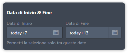 Puoi consentire la selezione dinamica di date impostando un limite Data di Inizio e Fine utilizzando l’espressione today+{n} (dove {n} rappresenta il numero di giorni da aggiungere alla data odierna).