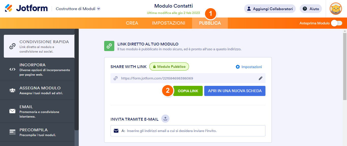 Quando un modulo viene creato, il costruttore di moduli genera un URL univoco tramite il quale accedere al modulo. Non appena sei pronto per pubblicare il tuo modulo, ti basterà condividere l’URL seguendo questi semplici passi: