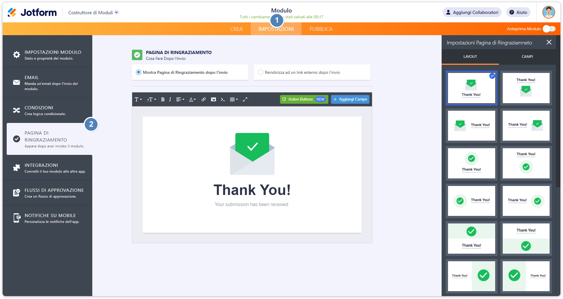- Impostazioni. Cliccando sull’icona è possibile modificare il layout della pagina di ringraziamento.