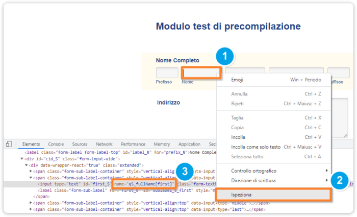 O per identificare più facilmente i nomi dei campi, puoi utilizzare la funzionalità Ispeziona Elemento. Clicca col tasto destro del mouse sul campo di cui desideri conoscere il nome, quindi scegli Ispeziona.