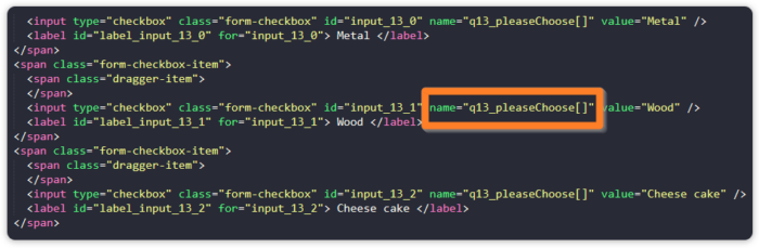 Ecco un campo checkbox di esempio per l’opzione “Wood”. Vediamo evidenziato il nome:
