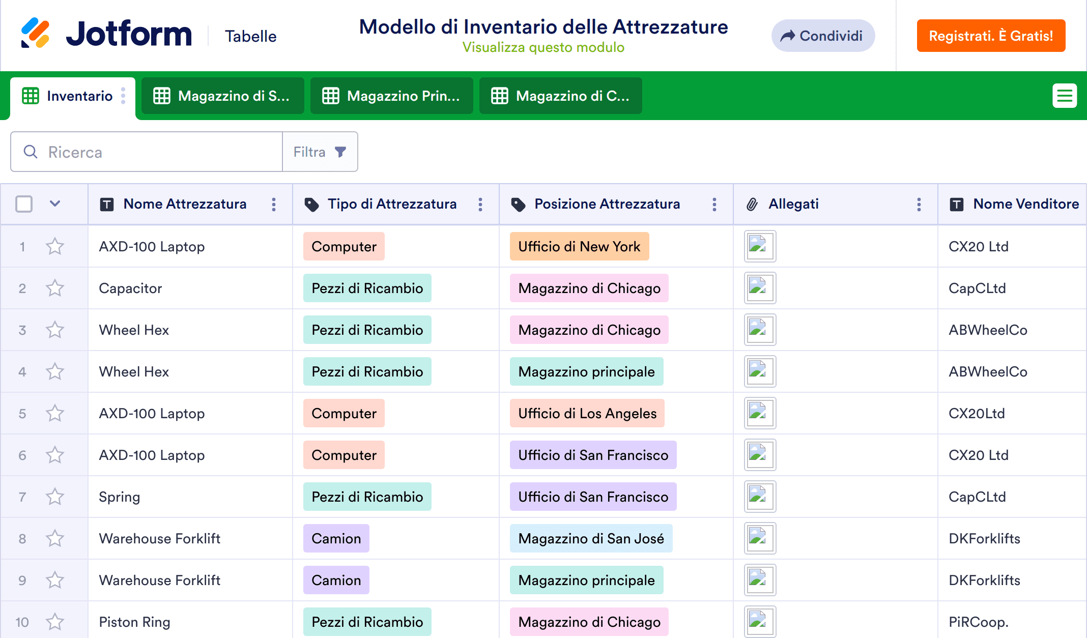 Un Modello di Inventario delle Attrezzature viene utilizzato dalle aziende per registrare le attrezzature disponibili per attività specifiche. Che tu gestisca un'azienda edile, un ufficio o un ospedale, il nostro modello Modello di Inventario delle Attrezzature gratuito renderà l'inventario più semplice che mai. Basta inserire i dettagli su ciascuna attrezzatura nel foglio di calcolo. Le tue informazioni saranno archiviate in modo sicuro nel tuo account Jotform e facilmente accessibili da qualsiasi dispositivo. Con la nostra app per dispositivi mobili gratuita potrai anche visualizzare e modificare il tuo Modello di Inventario delle Attrezzature mentre sei in movimento, anche senza accesso a Internet. Se sei responsabile di più magazzini, sentiti libero di aggiungere più schede al tuo modello in modo da poter registrare le attrezzature in base alla loro posizione. Una volta inseriti tutti i dettagli dell'inventario, sarai in grado di visualizzare il foglio di calcolo così com'è o nella visualizzazione calendario per vedere quando ciascun articolo è stato rifornito. Migliora il processo di gestione delle attrezzature con un Modello di Inventario delle Attrezzature personalizzato perfettamente funzionante!