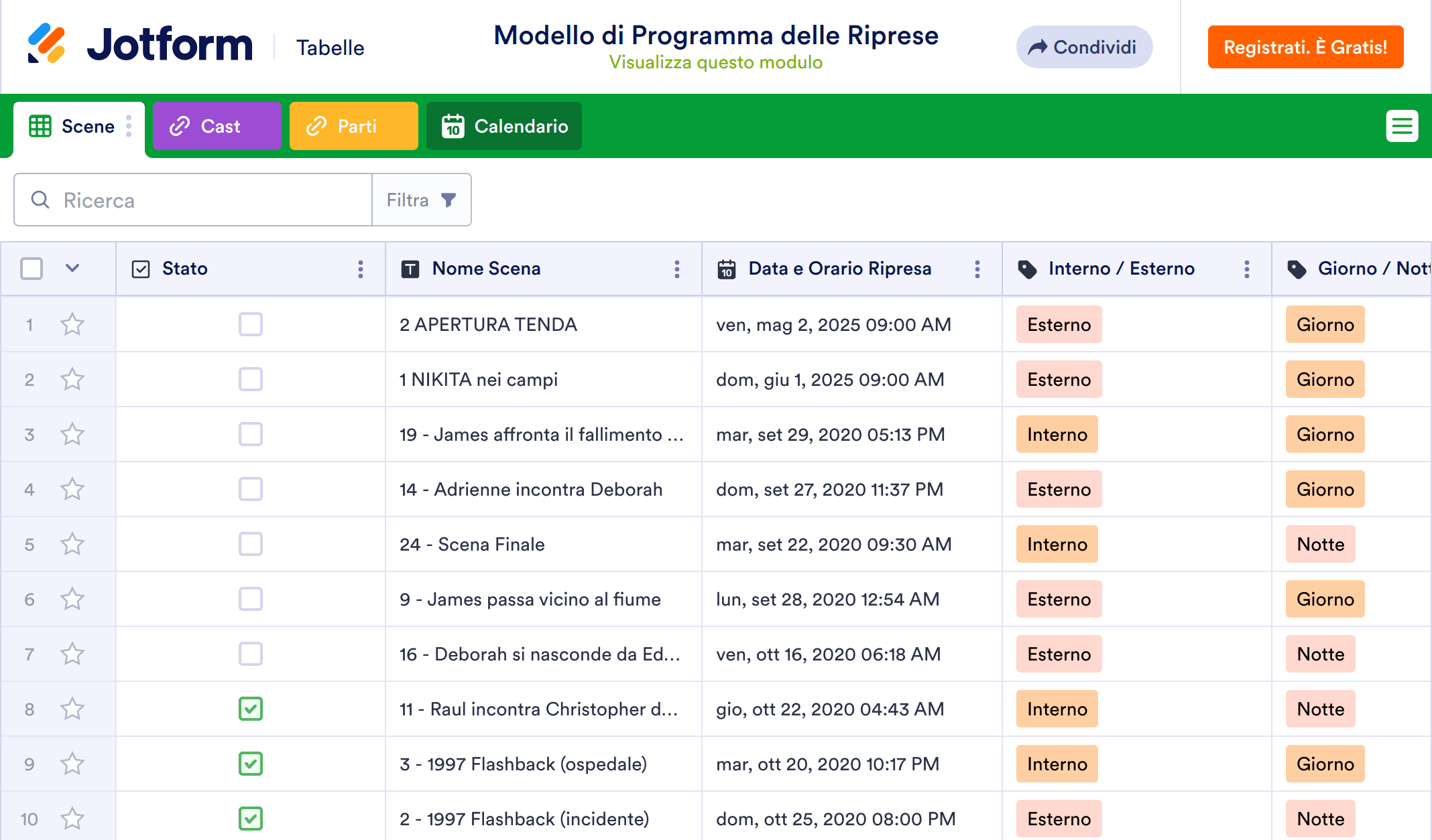 Tu e il tuo team vi impegnate a creare un film come nessun altro, quindi perché non creare un programma di riprese adatto? È facile personalizzare il nostro Modello di Programma delle Riprese per adattarlo perfettamente alle tue esigenze semplicemente aggiungendo più righe, colonne ed etichette colorate. Puoi anche creare schede aggiuntive per guardaroba, oggetti di scena, effetti speciali e budget. Una volta creato il piano di progetto perfetto con il nostro Modello di Programma delle Riprese, condividilo con il regista per iniziare a realizzare il tuo film: luci, motore, azione!