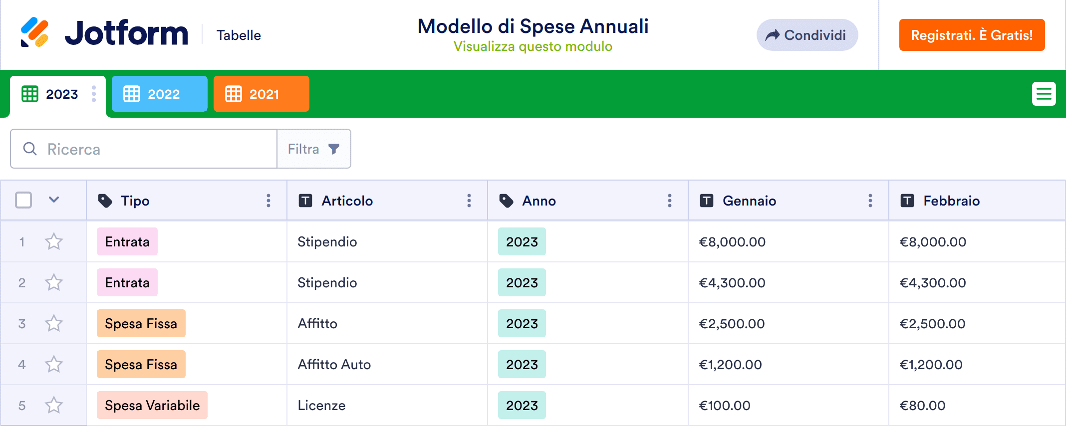 Gestisci con professionalità il tuo budget con un Modello di Spese Annuali gratuito! Con Tabelle Jotform, inizia personalizzando il design del modello, quindi aggiungi manualmente le informazioni sulle spese, carica un file CSV o Excel esistente oppure inserisci le informazioni sul budget tramite il modulo online allegato. Che tu stia tenendo traccia del tuo budget o gestendo le spese di lavoro, puoi aggiornare le informazioni da qualsiasi dispositivo, scaricarle come file CSV, PDF o Excel e persino condividere l'accesso alla tabella online con altri.