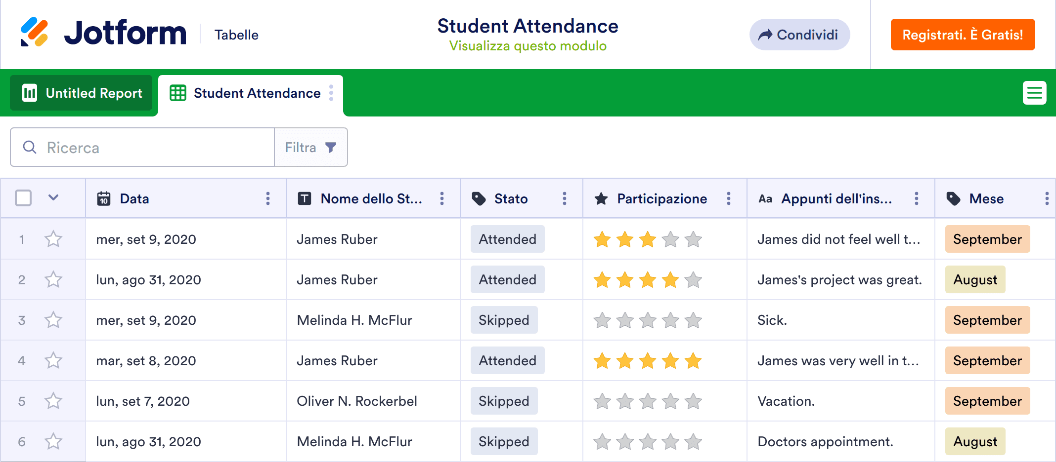 Non avrai bisogno di imparare a programmare per personalizzare il tuo foglio presenze studenti per la tua classe. Basta trascinare e rilasciare per aggiungere righe e colonne, creare etichette con codice colore, separare le classi per schede e filtrare i dati per gruppo. Quando hai finito, avrai un efficiente Foglio di presenza degli studenti che prenderà rapidamente la frequenza degli studenti senza consumare tempo prezioso in classe, così puoi concentrarti sull'insegnamento ai tuoi studenti - non tornerai mai più ai fogli di presenza cartacei!