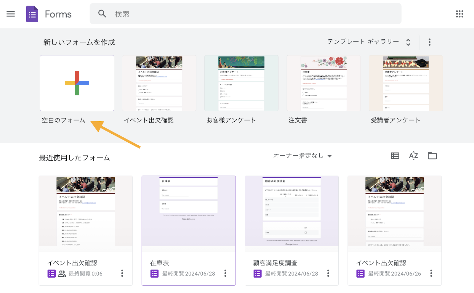 - フォームを作成しましょう。テンプレートを使わない場合は、Googleフォームの「空白のフォーム」ボタンをクリックするだけで、新規の空のフォームが生成されます。