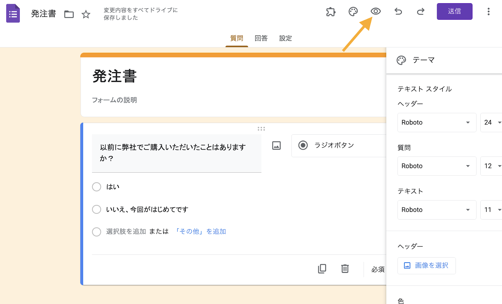 - フォームをカスタマイズします。Googleフォームに画像を追加したり、色やフォントを変更したりしましょう。会社のロゴを追加すれば、フォームの外観がよりプロフェッショナルなものになります。プレビューオプションをクリックすると、フォームの見た目を確認しながら作業できます。