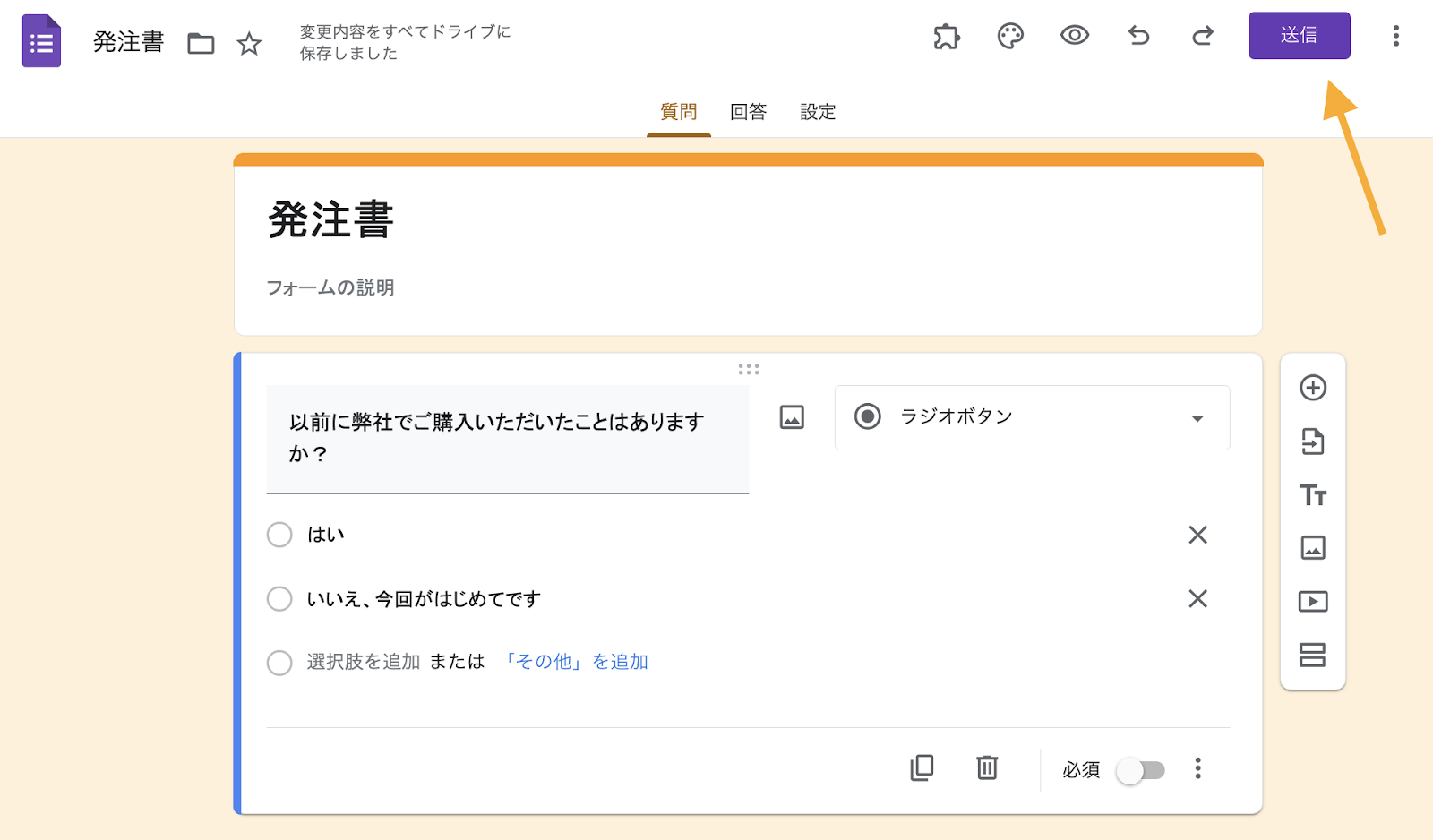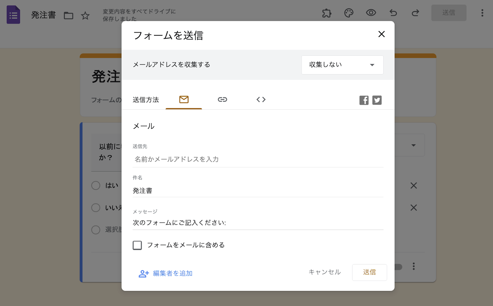- フォームの送信を開始します。Googleフォームの発注書を承認者に直接送信し、その後メールや共有リンクを介して販売業者にフォームを送信することができます。
