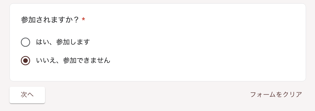上に戻って、出欠に関する質問を選択する。「はい」と答えた人はフォローアップの質問がある次のセクションに進んでも構いませんので、そのままにしておきます。しかし、「いいえ」と答えた参加ができない人には、そのセクションはスキップしてもらいたいところです。