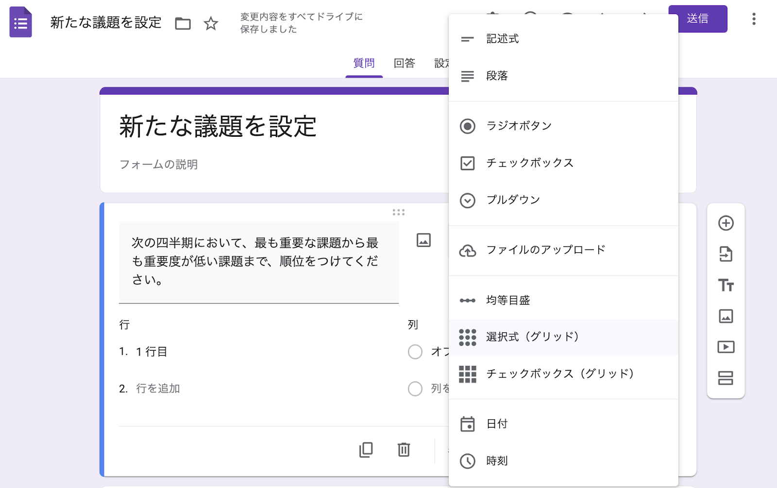 - 質問ボックスの右上にあるドロップダウンメニューをクリックすると、質問タイプに関する詳細なオプションが表示されます。ここで選択式(グリッド)を選択します。