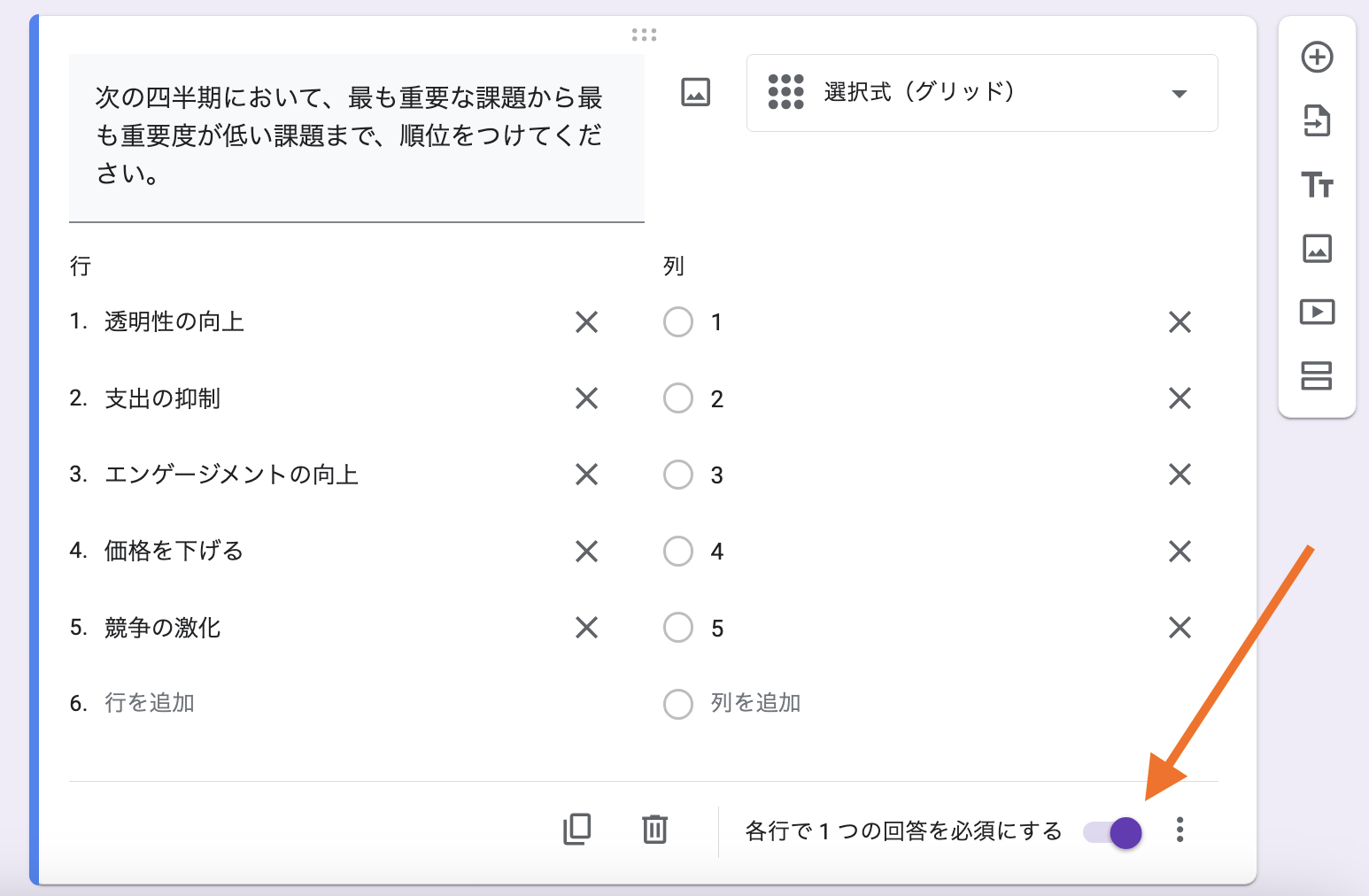 - すべての選択肢を入力したら、フォームを順位付けの質問として機能するように設定します。右下にある、「各行で1つの回答を必須にする」の横にあるトグルボタンをクリックして、回答者が各選択肢を順位付けするようにしてください。これで、回答者が選択肢をスキップすることなく、すべての選択肢に順位をつけることになります。